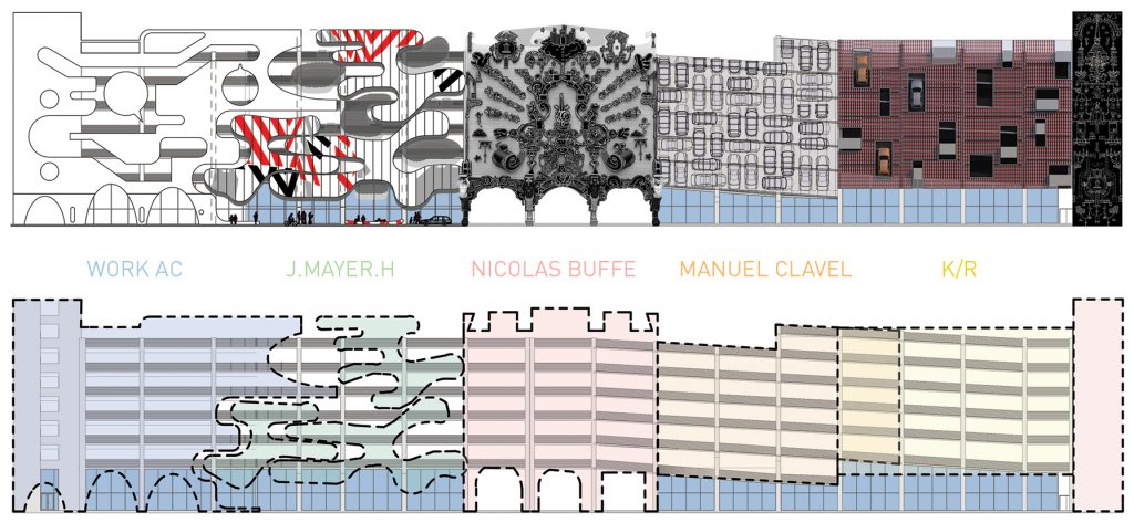 Cadde seviyesinde, garajın kemerli girişinde ve çıkışında konumlanmış, ortalama 7 m uzunluğunda, dört adet 3D karyatid figür göze çarpıyor. Aşağıdaki karyatidler gibi yukarıdaki kompozisyon da Buffe’nin çocuk oyunlarına ve Japon animasyonuna olan tutkusunu yansıtıyor. Sonuç; anime, tokusatsu ve manganın Buffe’nin diğer tutkuları olan Rokoko ve Barok mimarisiyle şaşırtıcı bir şekilde dizilişine dönüşmüş.