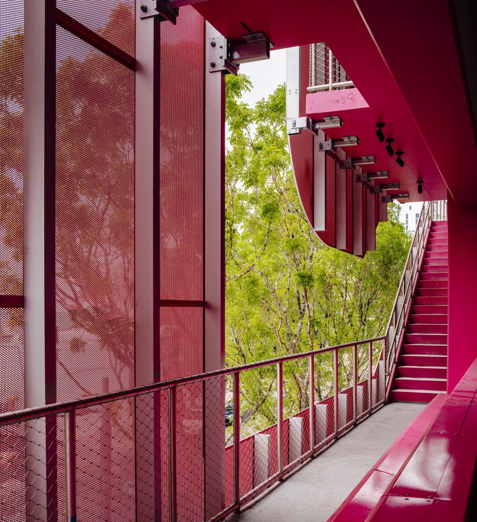 41. Cadde boyunca yer alan bir sonraki cephe, garajın giriş ve çıkışı olarak hizmet veriyor. Koyu perfore metal zemin ile inşa edilmiş cephe, Japonya’da yaşayan Fransız sanatçı Nicolas Buffe’nin eseri… Cephe, lazer kesim metallerden ve fiber reçine plastikten hazırlanmış çeşitli 2D ve 3D ögeler taşıyor.