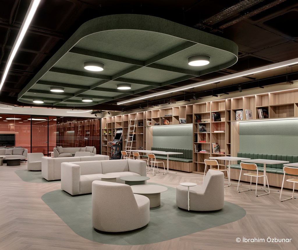 Tek ve çift kişilik çevrimiçi toplantılar için duvardan tavana akustik çözümlü telefon odaları ve “focus room”lar tasarlandı. Kahve ve çay noktaları, her ekibin kolayca erişebileceği şekilde stratejik noktalara konumlandırıldı.
