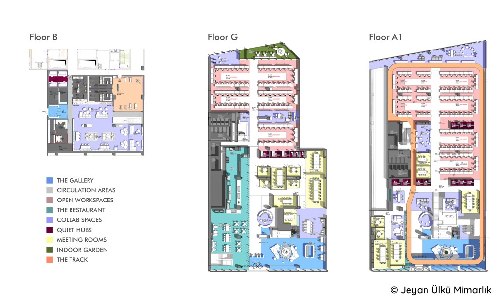Mekanın 11 metre kat yüksekliği olması düşeyde de farklı kotlarda odalar ve bunları birbirine bağlayan merdiven ve köprüler oluşturulmasına imkan sağladı. Galeri girişinin merkezine yerleştirilen büyük ağaçlı dış mekân mobilyası fokal nokta olarak belirlenerek balkon ve toplantı odaları bu merkeze bakacak şekilde tasarlandı.