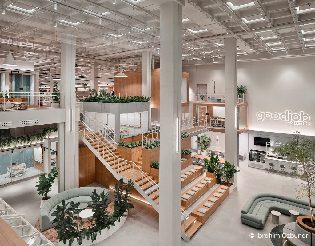 Bir mobil oyun teknolojisi şirketi olan Good Job Games’in tasarım ihalesinde müşterinin birincil taleplerinden biri hali hazırda mevcut ofislerinde yakalamış oldukları gayri resmi ve genç hissin yeni ofislerine de taşınmasıydı. Mevcut ofisin iki villanın birleşmesinden oluşan avlulu bir mekân olması, ve taşınılacak alanın Vadi İstanbul’da bir plaza binasının giriş katı olması genç ekibin öncelikli endişelerinden biriydi. Bir başka talepleri ise yeni ofislerinin, bahçe içindeki mevcut ofisleri gibi yeşillikli bir mekan olmasıydı.