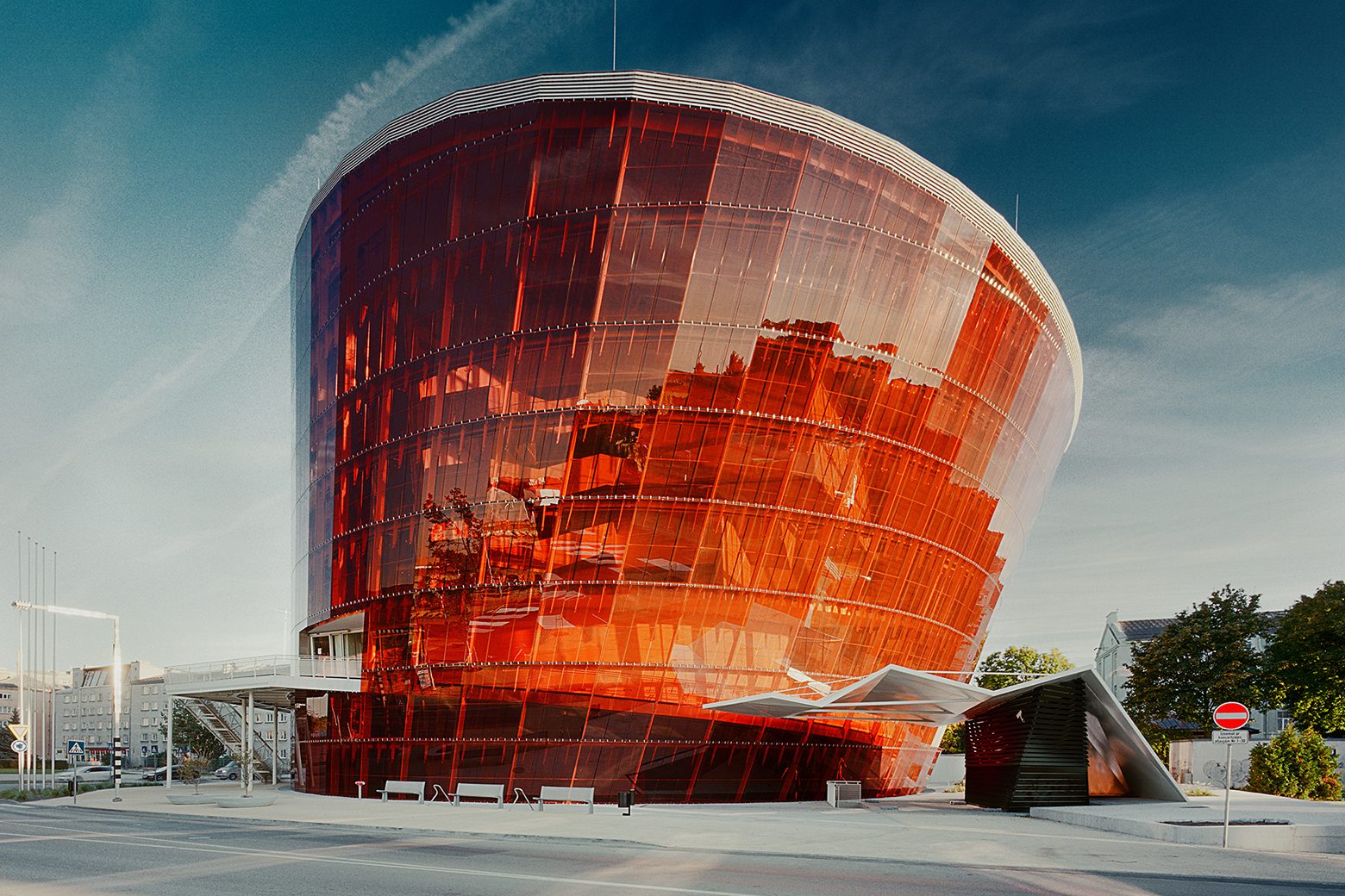 The concert hall is a concrete sculpture, cladded in and enveloped by a self-supporting variably tilted glazed facade. This facade consists of an interlocked wide flat steel structure that connects with the concrete sculpture in the roof area (resting upon the concrete sculpture). Structurally, the building is a reinforced concrete folded plate structure with a double-shell glazed facade and interior steel construction.